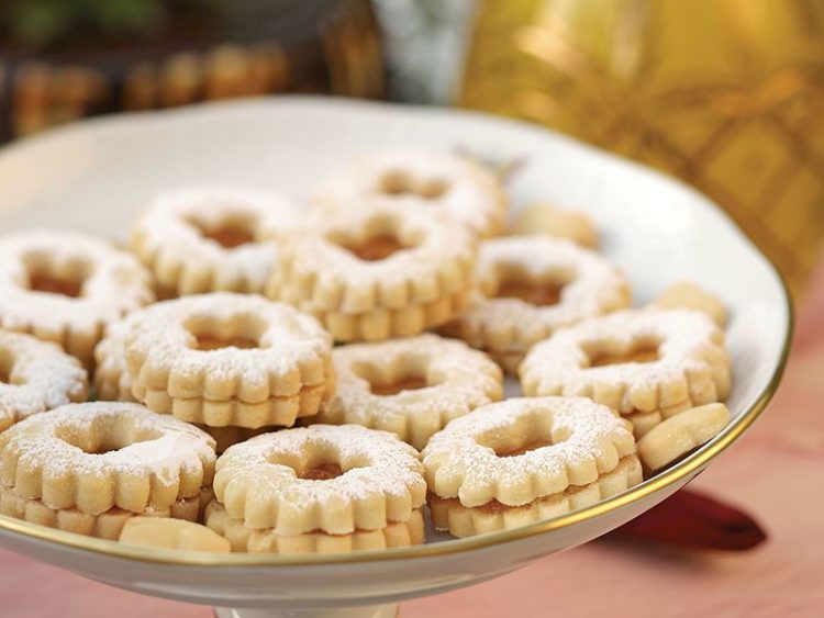 - *Soğuyan bütün kurabiyelerin üzerine şeftali marmeladı sürüp, ortası açık olanları üzerlerine yerleştirin..