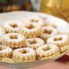 Soğuyan bütün kurabiyelerin üzerine şeftali marmeladı sürüp, ortası açık olanları üzerlerine yerleştirin..