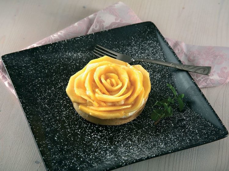 8. Kremanın üzerine tartın ortasından başlayarak dilimleri hafifçe bükerek kenarına kadar gül şekli vererek yerleştirin..