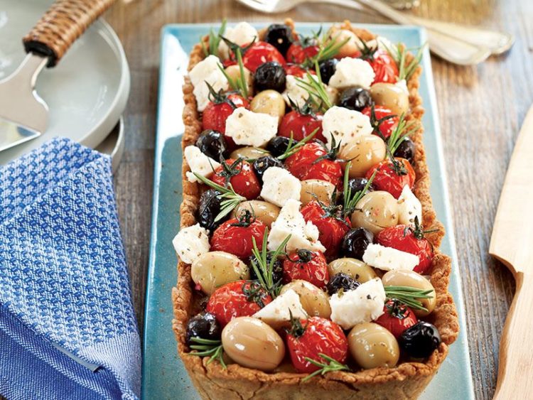 - Domatesleri ve zeytinleri tart tabanına doldurun..