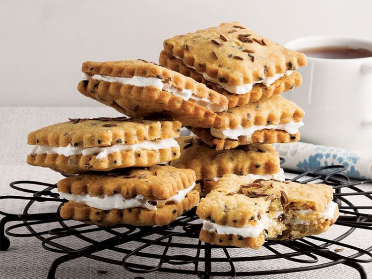 11. Soğuduktan sonra aralarına labne peyniri sürüp iki kurabiyeyi birbiriyle yapıştırıp servis yapın..