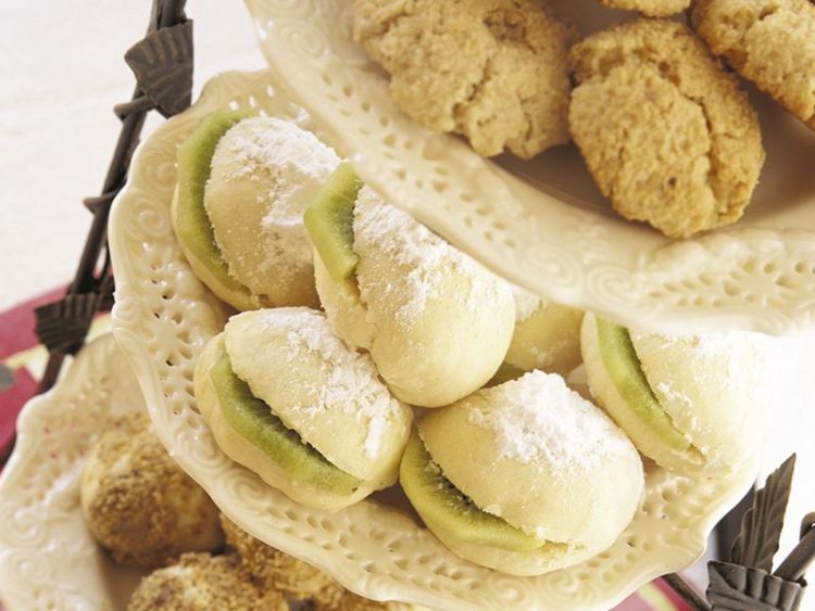 - Yanlarından hafifçe kesip arasına ince dilimlenmiş kivileri bir tarafı dışarıda kalacak şekilde yerleştirin..