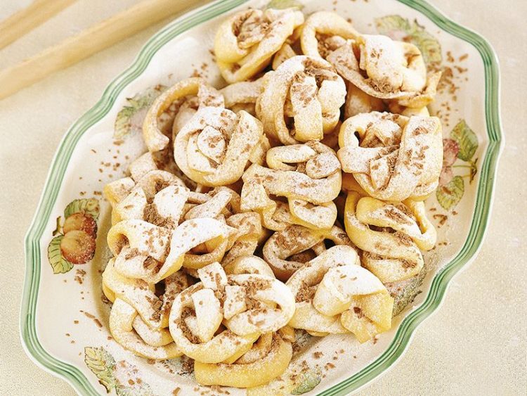 - 5 çorba kaşığı margarin 5 yumurta 5 çorba kaşığı tozşeker 1 su bardağı süt 5 su bardağı un 1 limon kabuğu rendesi Kızartma için sıvıyağ 1 tutam tuz 3 çorba kaşığı pudra şekeri 6 çorba kaşığı rendelenmiş çikolata