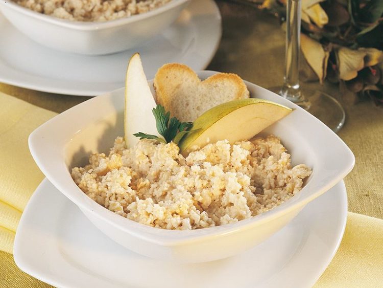 15. Nane, ekmek ve elma dilimleriyle süsleyip servis yapın..