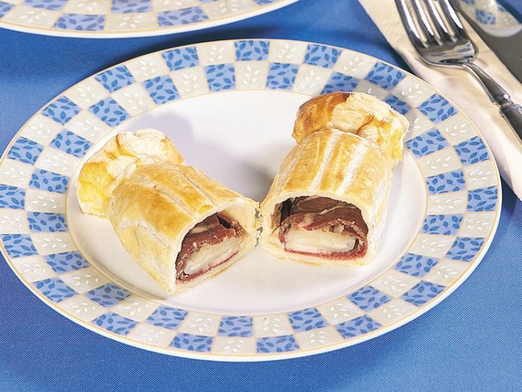 • 6 kare milföy hamuru2 pırasa3 dilim pastırma150 gr dil peyniri1 yumurta sarısı1 çorba kaşığı ılık suBir tutam tuz