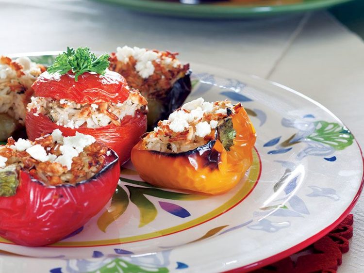 - Pirinç karışımını dikkatli bir şekilde domates ve biberlerin içine yerleştirin..