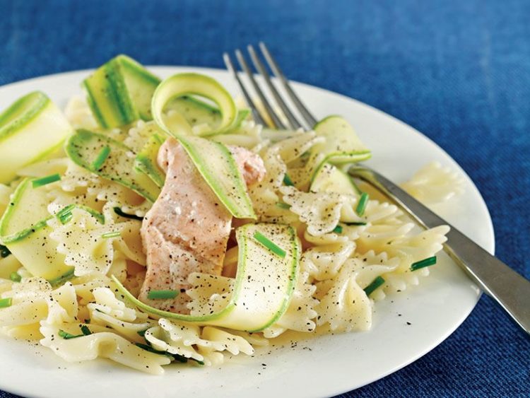 - Ocaktan alın, Makarnayla karıştırıp somonu yerleştirin..