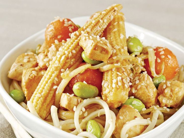 - Zeytinyağı, havuç, soya fasulyesi, soya filizi, tavuk etleri, mısır turşusunu wok tavada yüksek ateşte 2-3 dakika soteleyin..
