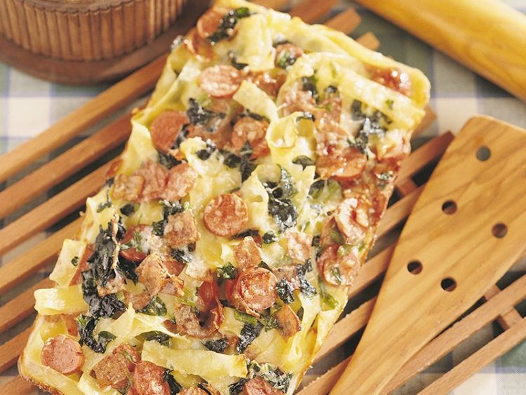 - 2 çorba kaşığı margarin Yarım paket erişte makarna 3 dilim dana jambon 3 sosis 2 yumurta Yarım su bardağı süt Yarım kase doğranmış ıspanak 3 çorba kaşığı rendelenmiş kaşar peyniri Yarım tatlı kaşığı hindistancevizi rendesi 1 yumurta sarısı