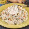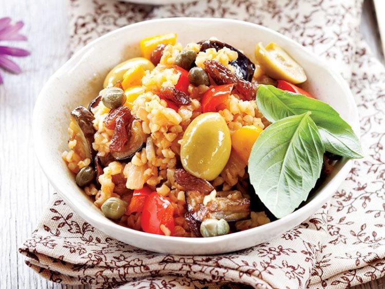 - Kızarmış patlıcan, biberler, kapari, üzüm ve zeytini pilava ekleyip harmanlayın ve ocaktan alın..