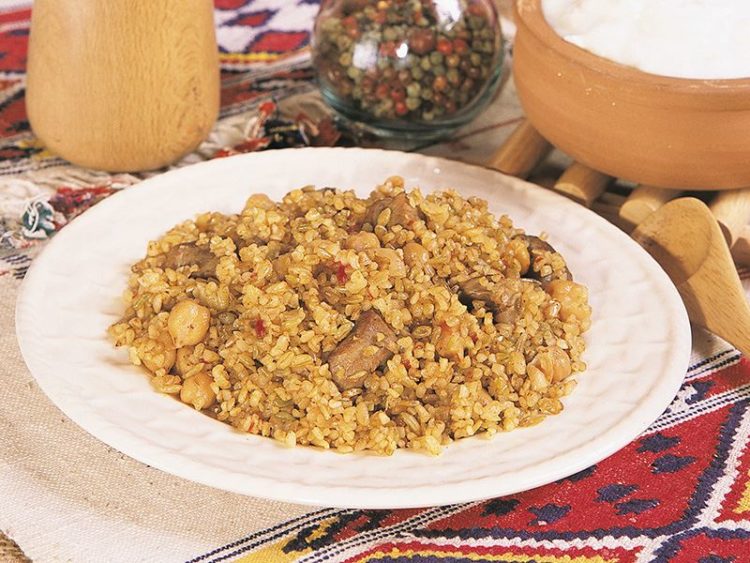 - 500 gr kuzu kuşbaşı1 büyük soğan250 gr firik250 gr pilavlık bulgur4 su bardağı sıcak su150 gr tereyağı1 su bardağı haşlanmış nohut1 çorba kaşığı biber salçasıTuz