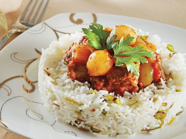 Fıstıklı pilav üzerinde çoban kavurma