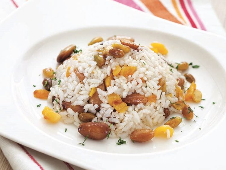 16. Pilav dinlendikten sonra fıstık, badem ve kayısıları da ekleyip tahta bir spatula veya düz bir kevgirle pirinçleri ezmemeye özen göstererek karıştırın..