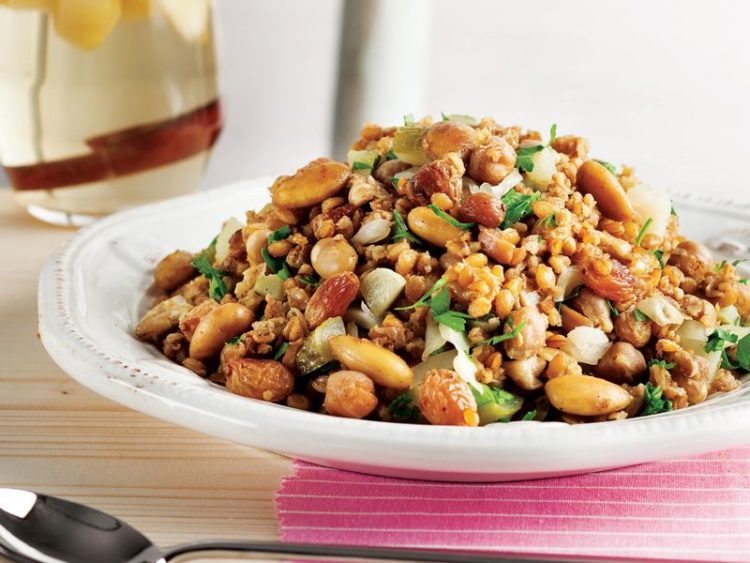 - Siyez bulguru, haşlanmış nohut, haşlanmış kuru fasulye, ceviz içi, yumuşayan badem ve üzümleri ilave edip 3-4 dakika kavurun..