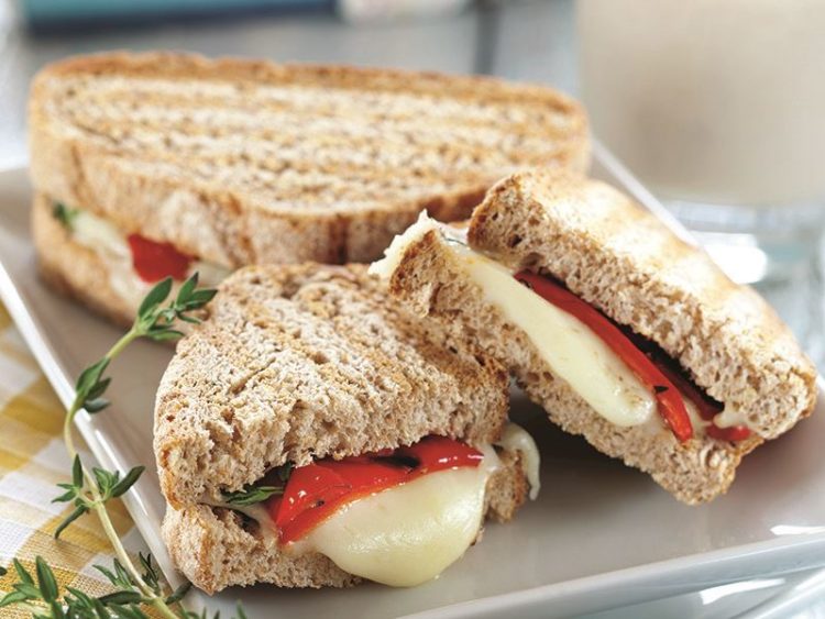 - Ekmek dilimlerinin arasına taze kaşar peyniri, közlenmiş kırmızıbiber ve taze kekik yapraklarını paylaştırın..