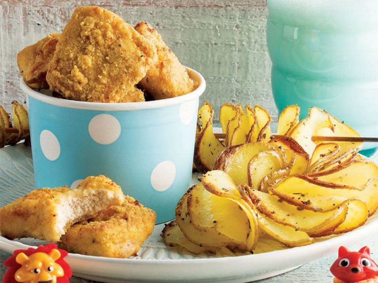 - Bebek patatesleri çöp şiş çubuklara geçirip yuvarlayarak incecik dilimleyin ve aralarını açın..