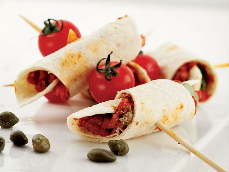 10. Lavaşların içine hazırladığınız sostan sürüp fesleğen ve kapari ekleyerek yuvarlayın ve bir kiraz domatesle birlikte kürdana geçirin..