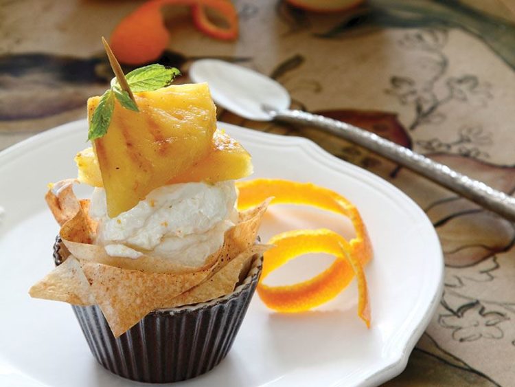 - Kızartılmış yufkaların içine bir top donmuş yoğurt, üzerine karamelize edilmiş ananasları ve karamel ilave ederek bekletmeden servis yapın..