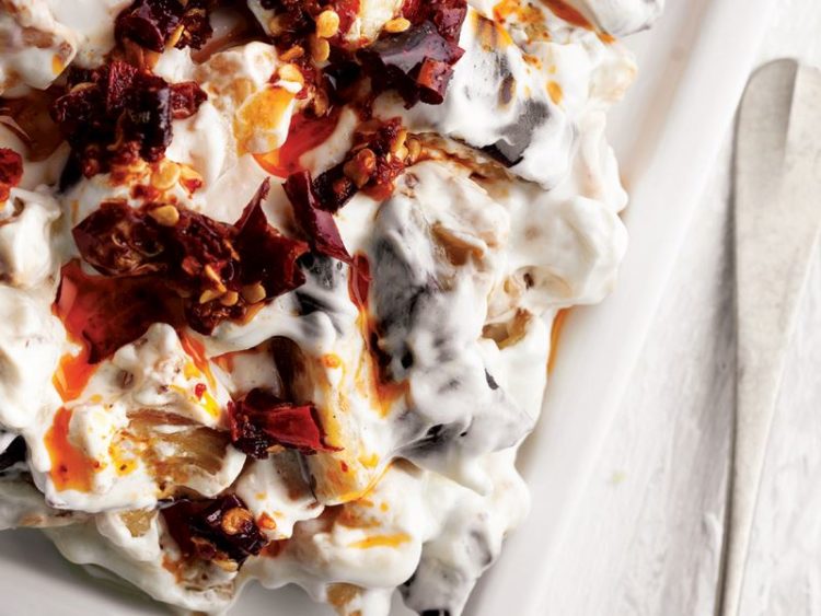 - Biberli yağlı ve yoğurtlu patlıcanın üzerine gezdirip servis yapın..