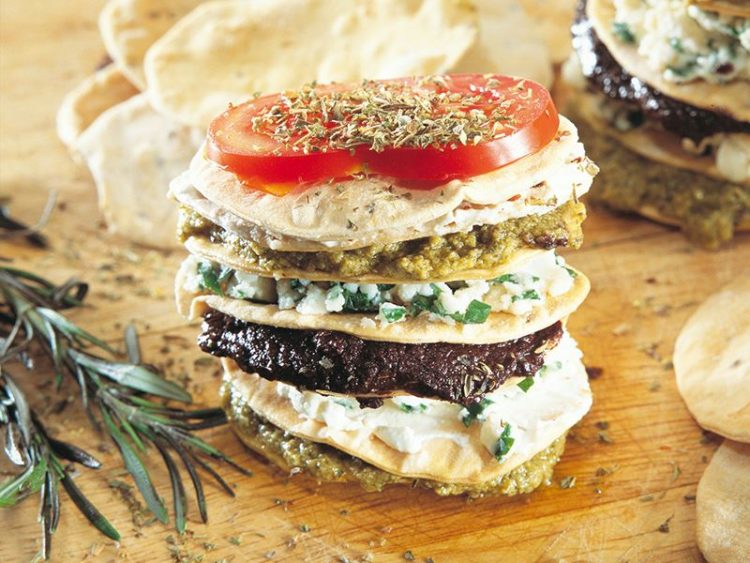 - Yeşil zeytin ezmesi, siyah zeytin ezmesi ve peynirli karışımı değişimli olarak 7 krakerin üzerine sürüp üst üste yerleştirin..