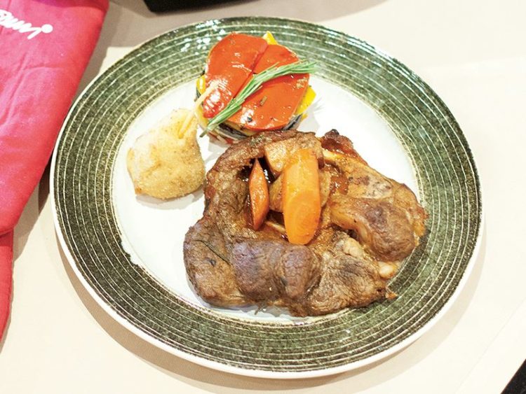 12. Armut patates, dana incik ve sebze kulesini servis tabağına dizip servis yapın..