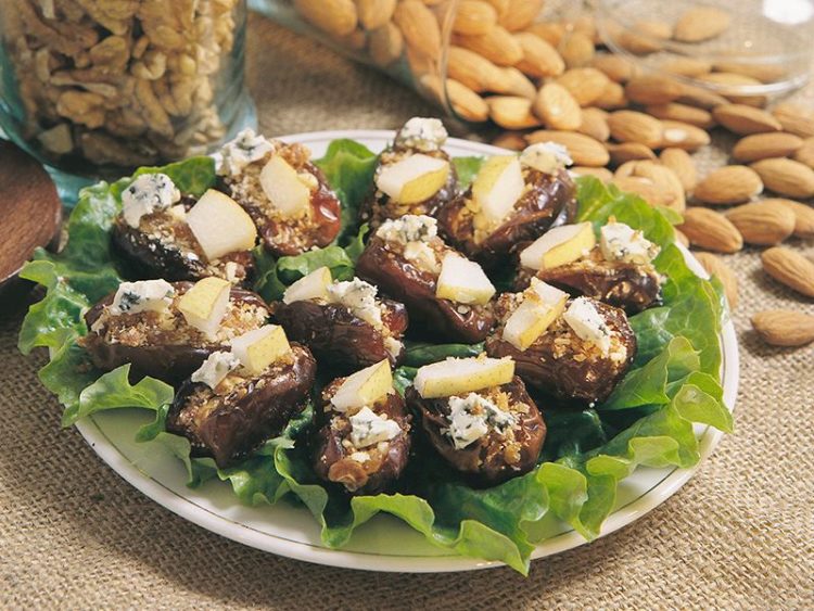 7. İncirli malzemeyi hurmaların içine doldurun ve servis tabağına dizin..
