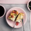 10. İnce dilimlenmiş sosisleri, küp doğranmış kırmızıbiberi, sivri biberleri ve domatesleri yufkanın üzerine yerleştirin..