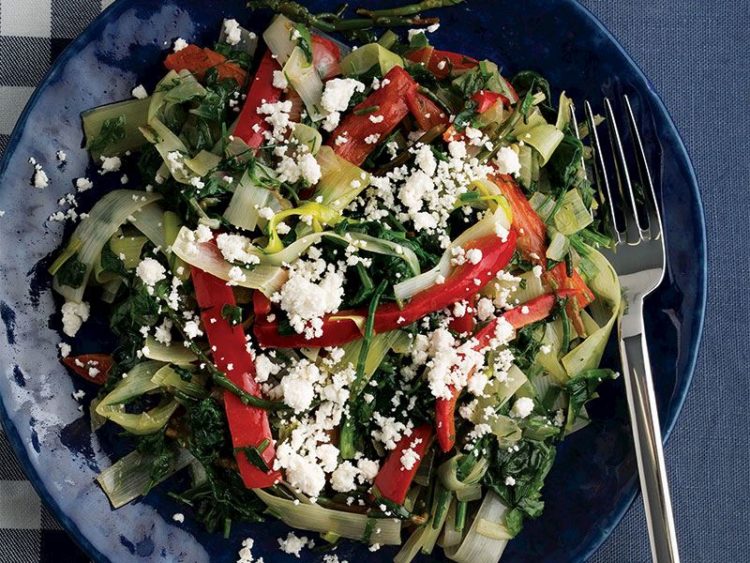 - Kırmızı kapya biberi, yeşil soğan ve ıspanağı ekleyip birkaç dakika daha soteleyin..