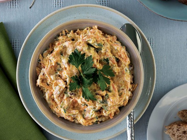- Ilınan havuçlar, yoğurt, mayonez, ince kıyılmış maydanoz, kalan zeytinyağı ve tuz ekleyip karıştırın..