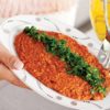 Domates, soğan, maydanoz, nar ekşisi, sumak, 1 tutam kimyon, limon suyu, zeytinyağı, tuz ve kırmızı pulbiberi derin bir kâsede çatalla ezerek karıştırın..