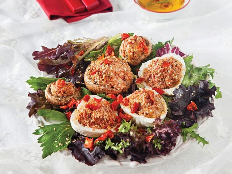 - Peynir ve mantar çanaklarını yeşilliklerin üzerine yerleştirin ve üzerine kavrulmuş susam serpip servis yapın..