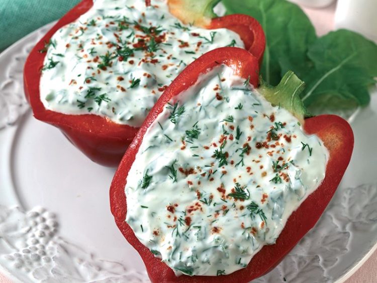 - Biberleri ortadan ikiye kesin ve yoğurt karışımını içlerine doldurun..