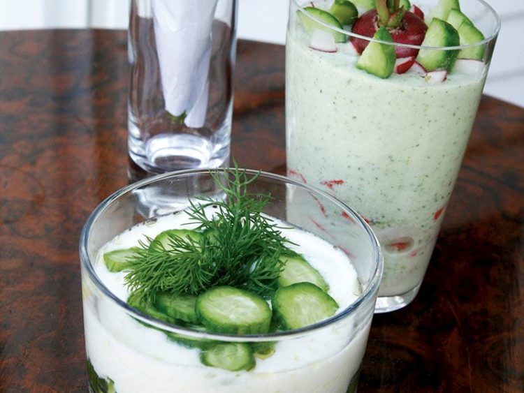 - Dilimlenmiş salatalık ve dereotu ile süsleyip servis yapın..