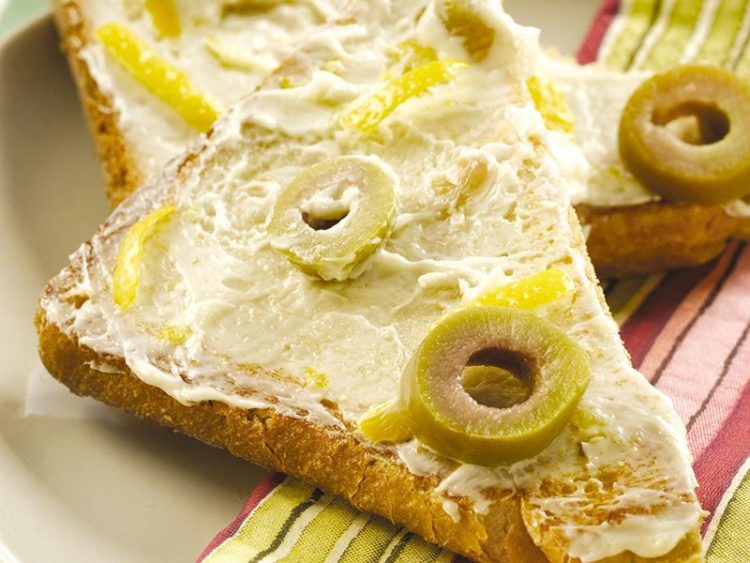 - 250 gr zeytinyağlı margarin, 1 limonun rendelenmiş kabuğu ve 2 çorba kaşığı dilimlenmiş yeşil zeytinleri bir kapta iyice karıştırın..