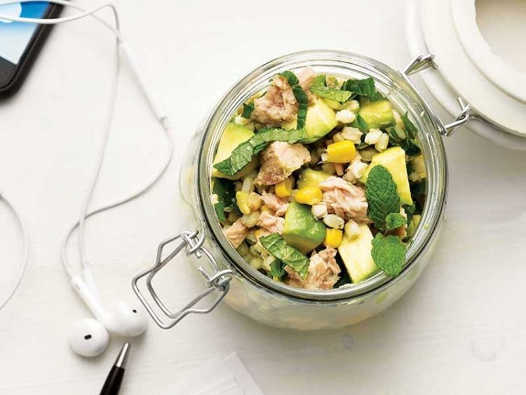 - Kavanozun dibine haşlanmış buğdayı, üzerine kabuğunu soyup küp küp kestikten sonra limonla ovaladığınız avokadoyu yerleştirin..