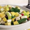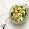 - Salata kasesine ıspanak yaprakları, mısır, soya filizi, dilimlenmiş avokado ve soğanı alıp harmanlayın..