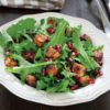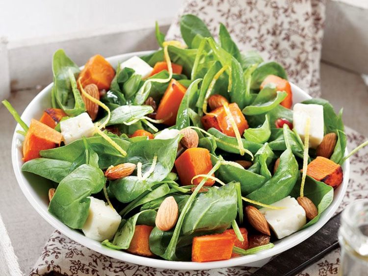 - Ispanağa küp doğranmış peynir, nar taneleri, üzüm, badem ve bal kabaklarını ekleyin..