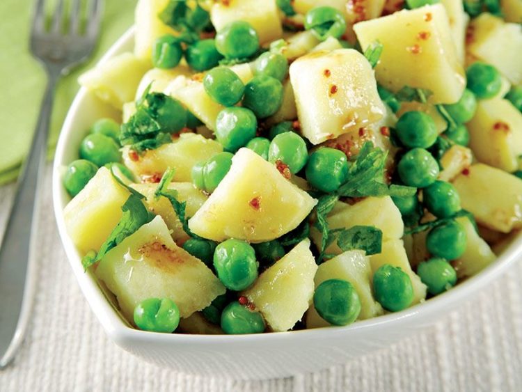 - Patates ve bezelyeleri bir kasede harmanlayıp servis tabağına alın..