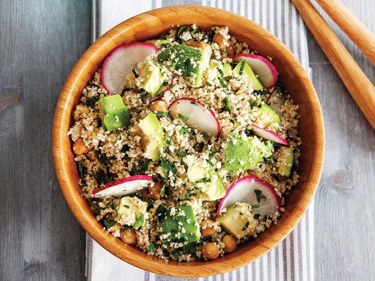 - Nohut, lor peyniri, kırmızı turp, maydanoz ve avokadoyu ekleyin..