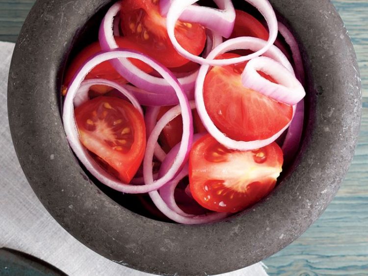 1. Domatesleri iri, soğanları halka doğrayıp bir servis kasesine alın..