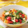 - Kiraz domatesleri ortadan ikiye keserek ekleyin..