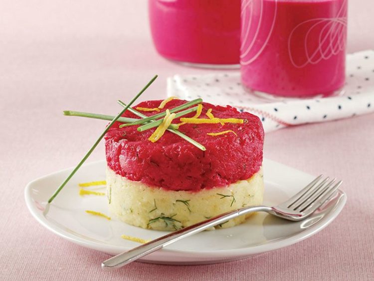 - Üzerine pancarlı patatesten doldurun ve çemberden çıkartın..