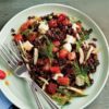 14. Küp kestiğiniz keçi peynirlerini ve kaparileri salatanın üzerine yerleştirip servis yapın..