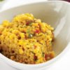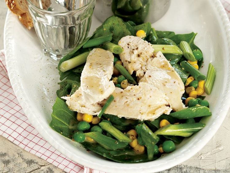 - Üzerine ince dilimlediğiniz taze soğan, haşlanmış mısır ve bezelyeyi ekleyip harmanlayın..
