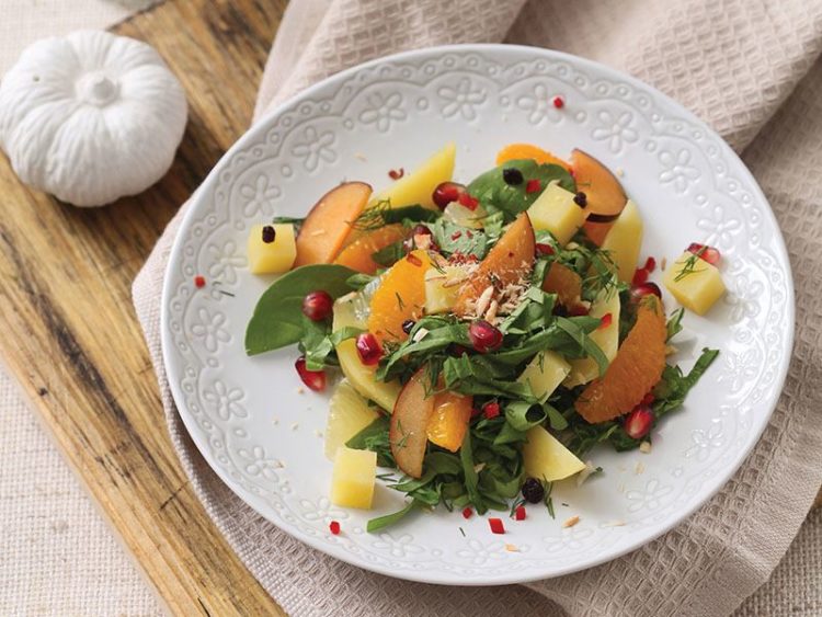 - Erik, portakal, nar tanesi, kırmızıbiber ve patatesi rokaya ilave edin..