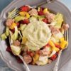 - Bir çatal yardımıyla çırpın ve salatanın üzerine gezdirip karıştırın..