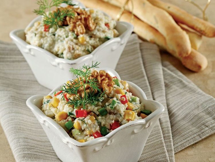 - Bulgura önce mayonez ardından soğan, dereotu, sarımsak, biber, mısır, ceviz içi ve tuz ekleyip karıştırın..