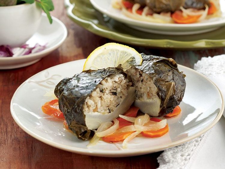 - Geniş bir tabağın üzerine sıcak suda haşlanmış 4 adet taze asma yaprağını bir kare oluşturacak şekilde yayın..