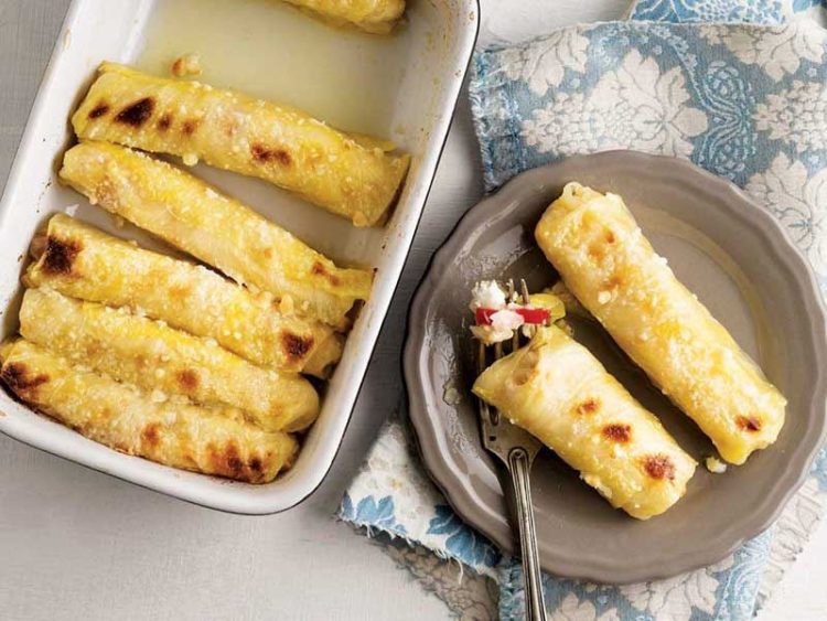 6. Zeytinyağı sürüp rendelenmiş parmesan serpilen fırın kabına ruloları yerleştirin..
