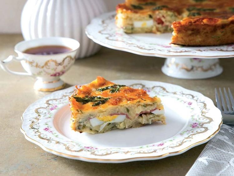- Sırasıyla jambon, çedar peyniri, domates ve katı yumurtaları patates hamurunun üzerine yayın..